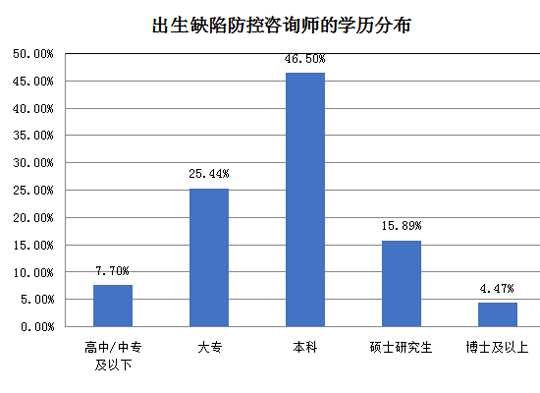 從單位性質(zhì)來看,專業(yè)醫(yī)療機(jī)構(gòu)中的出生缺陷防控咨詢師最多,占比67.23%。其他分別為:10.85%在社區(qū)衛(wèi)生機(jī)構(gòu),14.58%政府機(jī)關(guān)、企業(yè),6.05%在檢測機(jī)構(gòu),1.29%在殘聯(lián)康復(fù)機(jī)構(gòu)、教育機(jī)構(gòu)、社會公益組織。由此可見,出生缺陷防控咨詢師的從業(yè)范圍并不只局限于專業(yè)醫(yī)療機(jī)構(gòu),而且分布在與出生缺陷防控相關(guān)各行各業(yè),就業(yè)面廣。