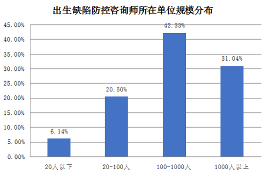 出生缺陷防控咨詢師在各個(gè)規(guī)模單位中均有分布,中型大型單位占主流。42.33%的出生缺陷防控咨詢師在100-1000人的中型單位,31.04%的在1000人以上的大型單位,20.50%的在20-100人的小型單位,6.14%的在20人以下的微型單位。